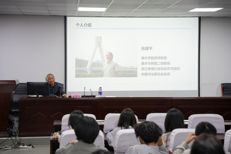 讲座尾声,张建平教授以“人生感悟”作结。他从童年瓯江畔摸鱼跳水的野趣、少年露天球场捡球模仿的逐梦,谈到青年受家训“坦坦荡荡做人,踏踏实实做事”的浸润,直言“自然与家风是人格的初始底色”。他更以“书韵青瓷”创作寄语学子:“文化传承需以自身被塑造的生命,传递文化的力量。”