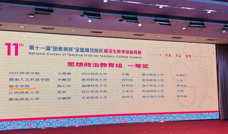 11月30日,第11届田家炳杯全国师范院校师范生教学技能竞赛在浙江师范大学落下帷幕。我校马克思主义学院思想政治教育(师范)22级陈心如同学(指导教师吴春莺、郑海友)获得思想政治教育(高中组)一等奖!这是我校第一次参加参赛,此次获奖实现了我校在该项赛事上零的突破。