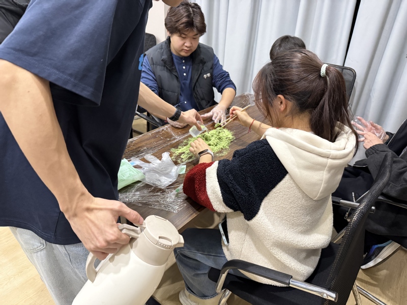本次活动设置“承民俗·扬传统”与“寄心语·送安康”两个环节。活动伊始,同学们分为5组,每组6人,在工作人员引导下有序领取冰皮预拌粉、低糖红豆沙、芋泥、肉松咸蛋黄等食材及一次性手套、包装盒等工具。接着,各组同学分工协作,将开水分次倒入预拌粉中搅拌揉匀,直至面团光滑细腻,随后搓条分剂、压皮包馅、收口搓圆,一枚枚圆润精致的冰皮青团渐次成型。现场氛围热烈而有序,同学们在动手实践中不仅掌握了传统时令点心的制作技艺,更在协作配合中增进了彼此情谊。